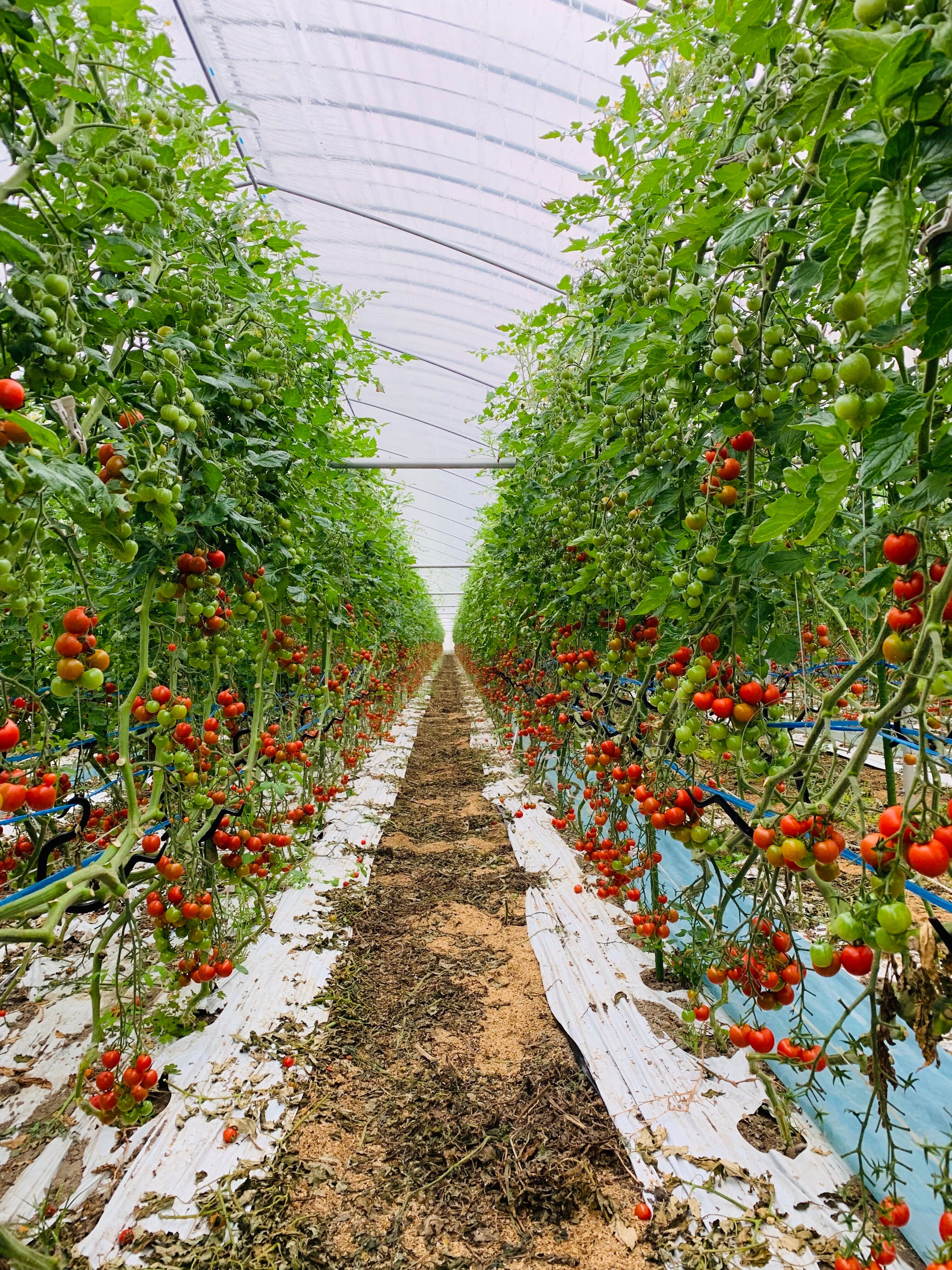 苗を植える前に栄養たっぷりにした土壌をガチガチにローラーで固めます。マルチングを被せ穴を1個1個ドリルでドドドッと開けて苗を植えることで、苗が水を求め硬い土を打ち砕きながら張り巡ります。強い根を作る事でより多くの水と栄養を取り入れる事が出来るようになりトマトのおいしさにつながります。